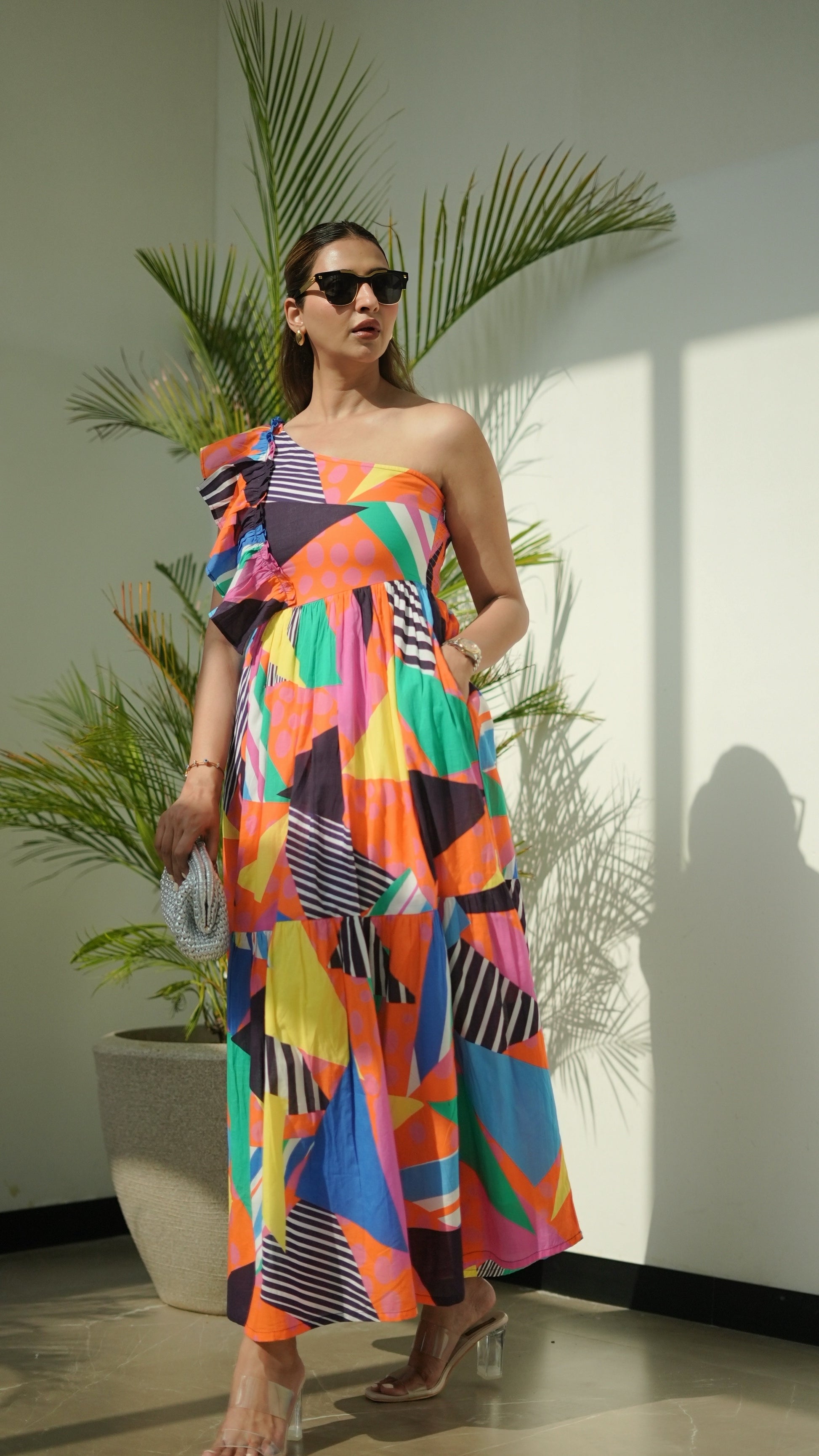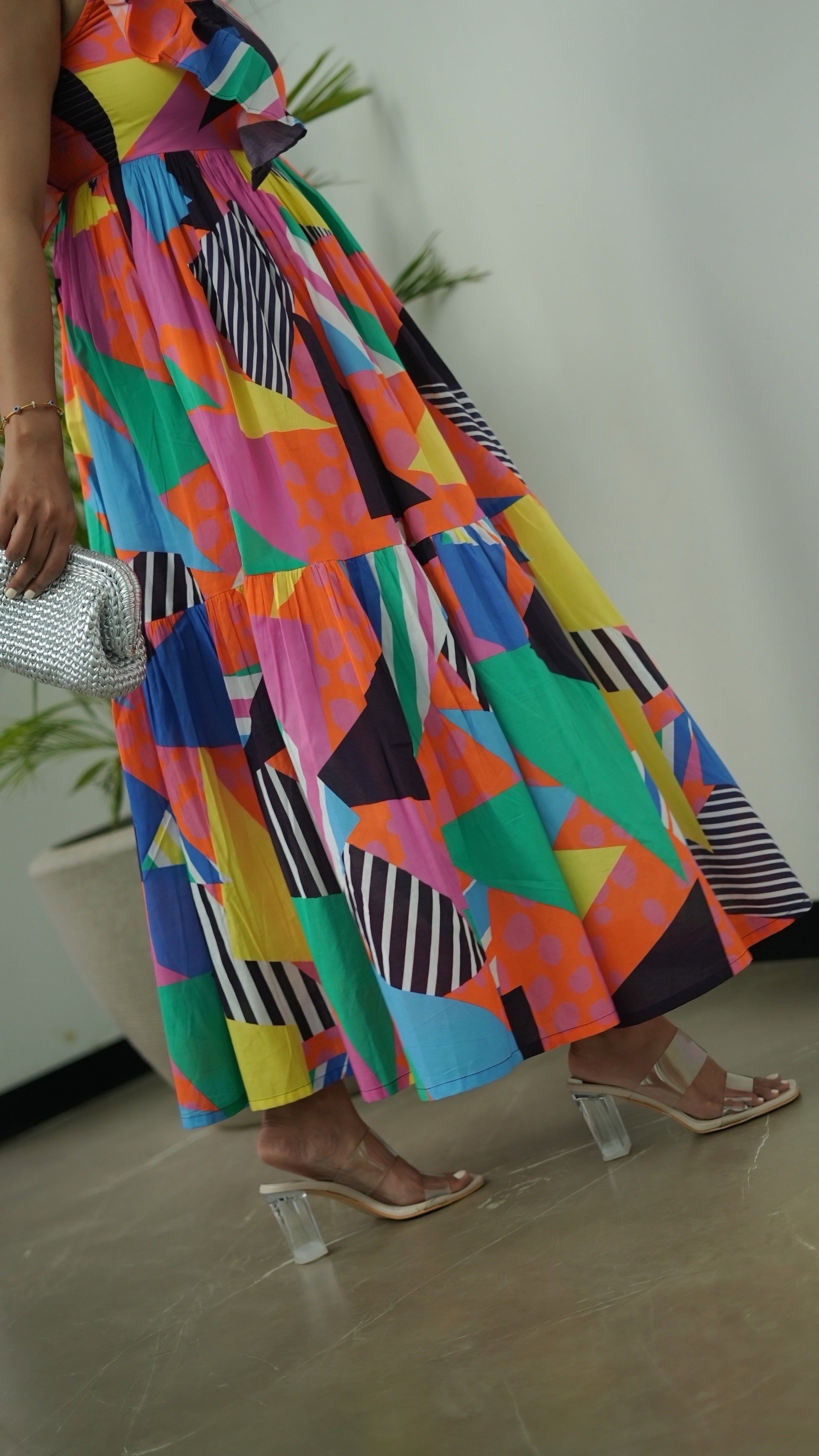 Make a head turning entrance in our multicolour print one shoulder maxi dress – a vibrant blend of modern shapes and tropical color splashes. Featuring an asymmetrical neckline with a playful shoulder ruffle and a smocked bust, this flowy tiered silhouette is a celebration of effortless glam. Crafted in a bold geometric patchwork print with contrasting stripes and pops of orange, green, pink and navy, this dress is perfect for vacation nights, beach brunches or parties. It has got side pockets for added functionality .Pair it with heels and a statement bag for a chic getaway look or pair with flats and a tote/ sling bag for a relaxed look. It comes with under cotton lining.