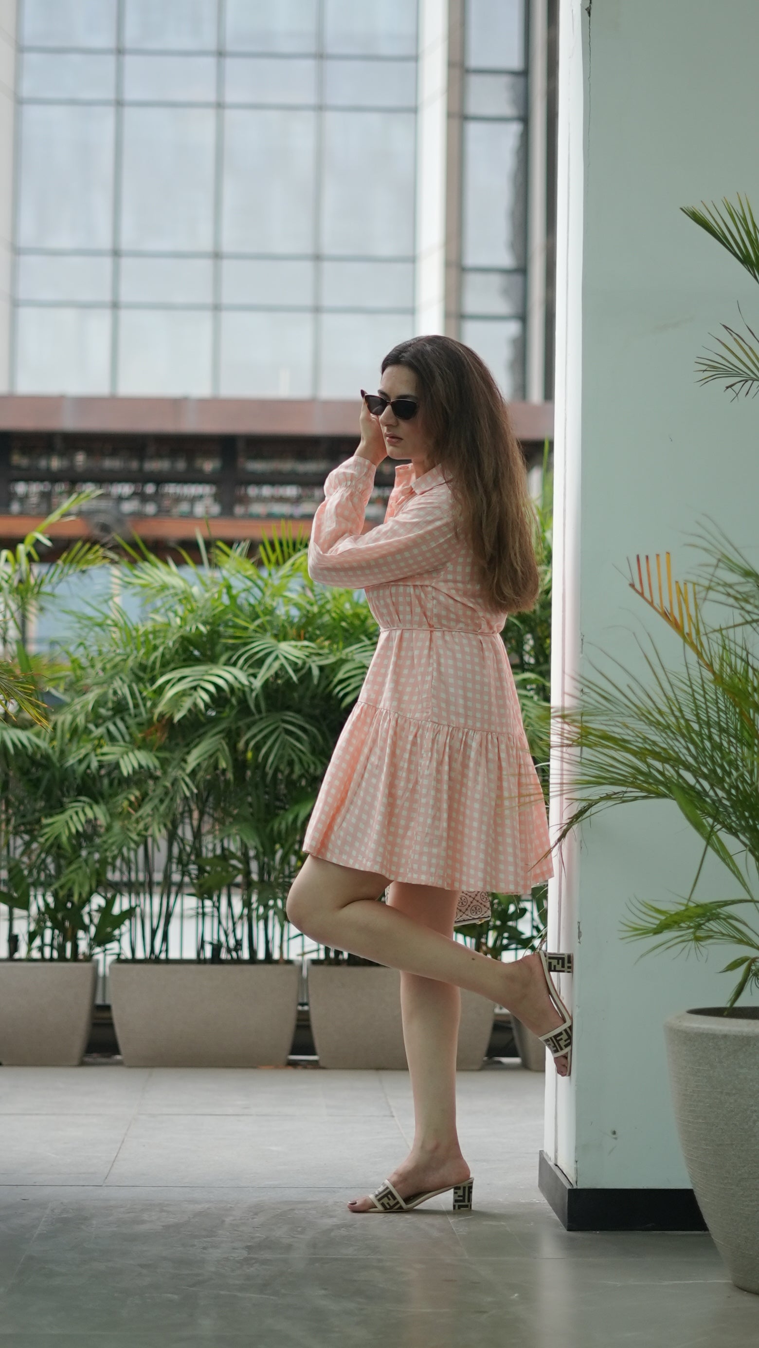 Say hello to easy charm with our peach gingham shirt mini dress – a soft, playful piece that blends classic checks with a youthful silhouette. Designed in a delicate peach and white gingham pattern, this dress features a collared neckline, button- down front, pockets on both sides, removable waist belt and subtle puff sleeves. The gathered waist and flared mini hem create a flattering A-line shape, making it your ideal pick for running errands, casual brunches, vacations or weekend outings. Team it with slip on sandals, loafers or heels for a breezy, brunch ready vibes. It comes with under cotton lining.