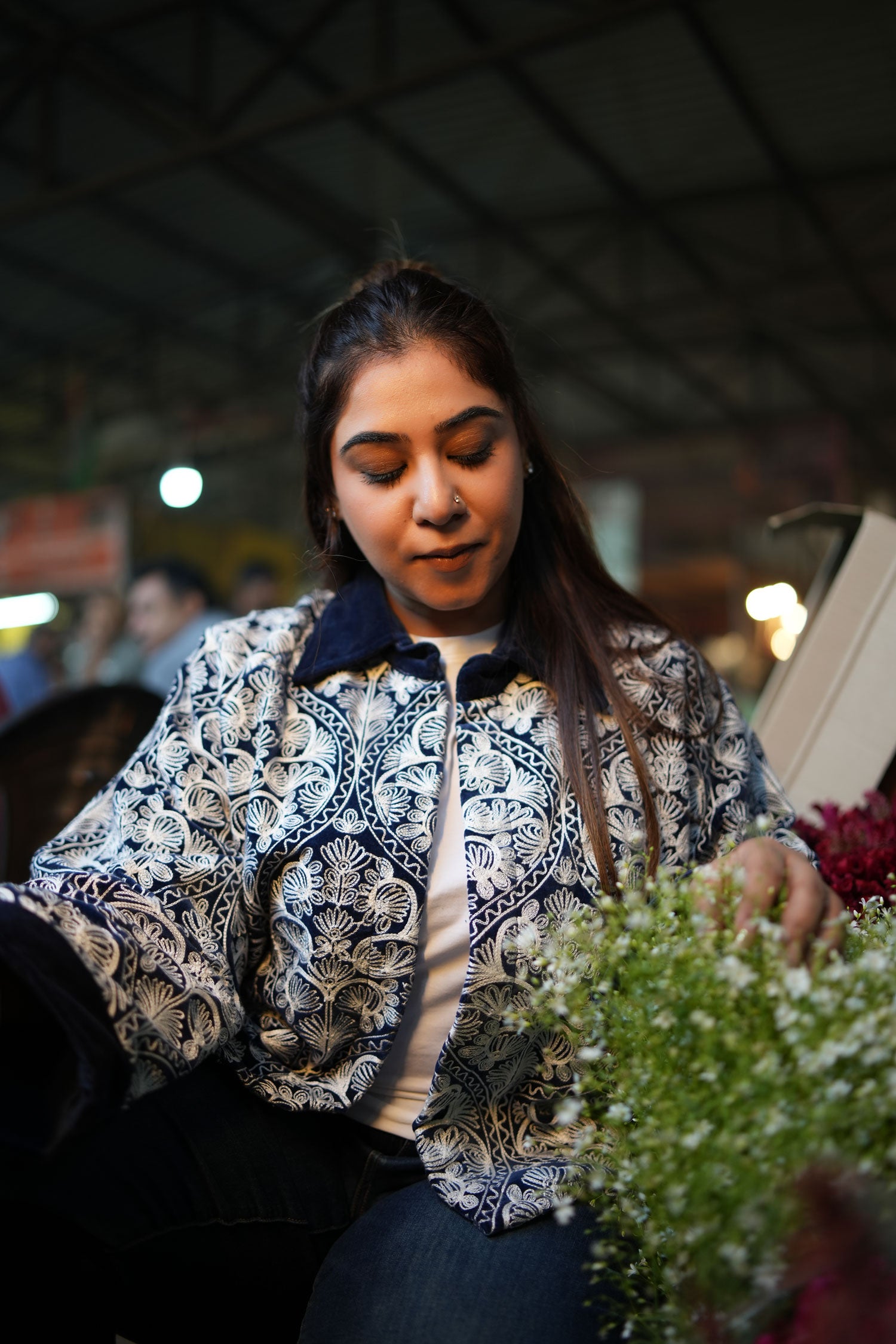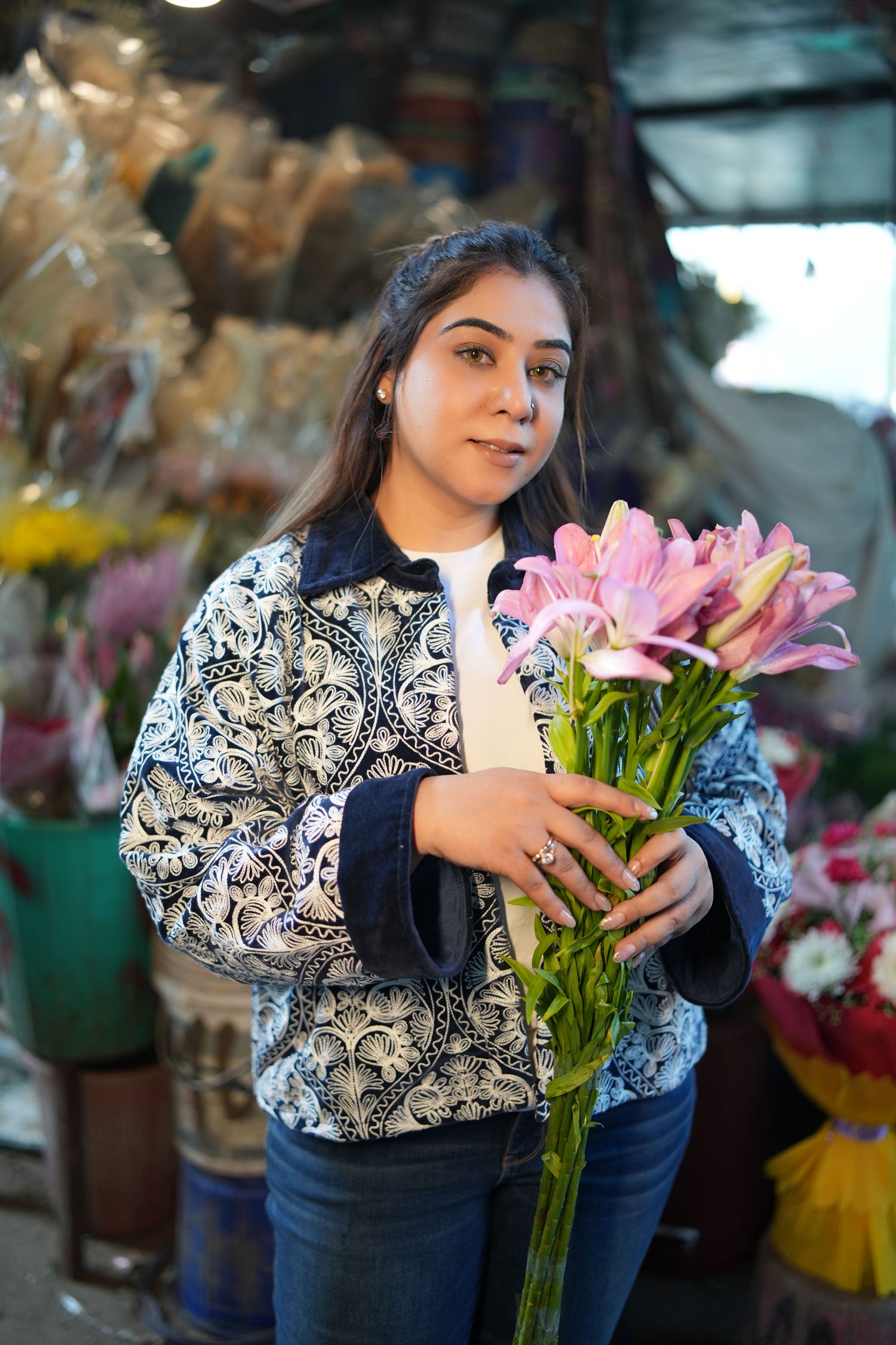 Each motif blooms like a story from a bygone era- DETAILED, GRACEFUL AND TIMELESS. Whether layered over denims for a casual day out or draped atop a classic kurta for evening soirees, it carries the charm of HAND EMBROIDEREY with the versatility of modern wear. The Silhouette is relaxed, the texture comforting and the story deeply rooted.