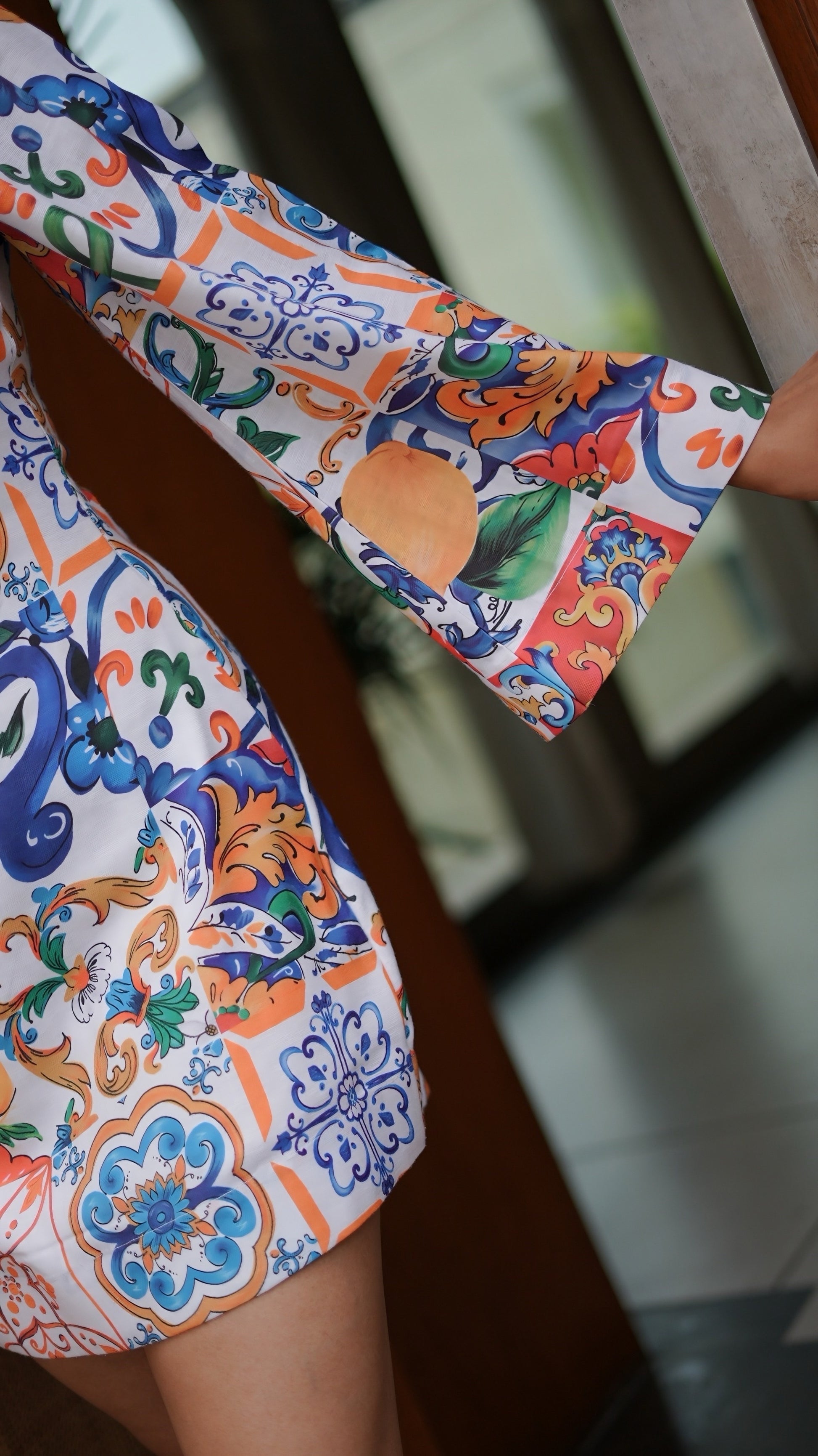 Make a bold style statement with the Mediterranean MOSAIC flare sleeve mini dress. Featuring a striking print this dress comes with flared bell sleeves and a flattering V neckline that adds a playful yet elegant flair. The structured fit hugs your curves, while the smooth, breathable fabric ensures comfort all day long. Pair it with nude heels and a gold statement bag for an effortlessly bold look. It comes with under cotton lining to avoid fabric transparency.